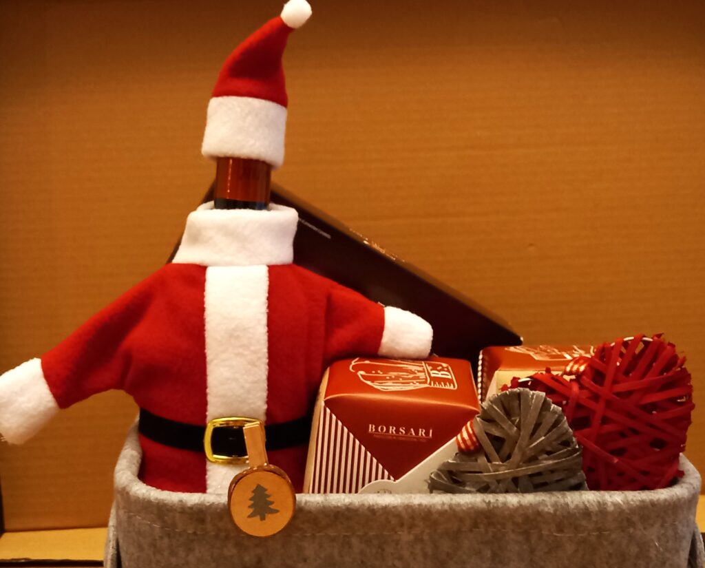 • Бутилка вино Мерло, реколта 2019, Тоскана, Италия, но със златна премия от конкурс във Франкфурт; преоблечено като дядо Коледа;